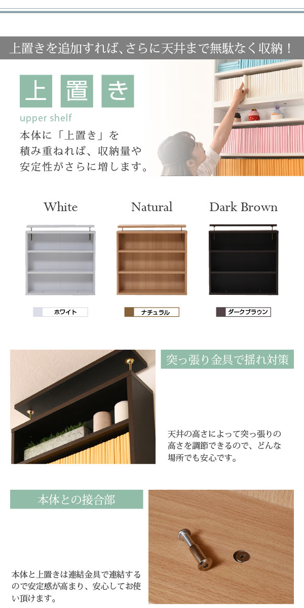本体と合わせれば、本棚の上のデットスペースも有効活用! 【サイズ(約)】 幅60×奥行16×高さ57.5〜66.5cm (オープン部)幅56×奥行14.5×高さ42〜51cm (可動棚)幅56×奥行14×厚み1.5cm(1cmピッチ31穴) 【素材】 プリント紙化粧繊維板 【耐荷重】 可動棚:約5kg以下 【収納量】 文庫本:約111冊 コミック:約74冊 DVD:約74枚 CD:約168枚 Blu-ray:約86枚 【生産国】 中国製 【備考】お客様組立(20分)1cmピッチラック 幅90cmタイプ W90 上置き W90 本体 W90 上置き+本体 1cmピッチラック 幅60cmタイプ W60 上置き W60 本体 W60 上置き+本体