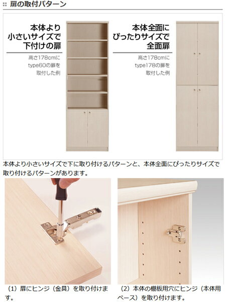(本体幅45cm〜90cmは両扉)おすすめの加工オプション扉の取付けには、棚板用の穴を使用します。